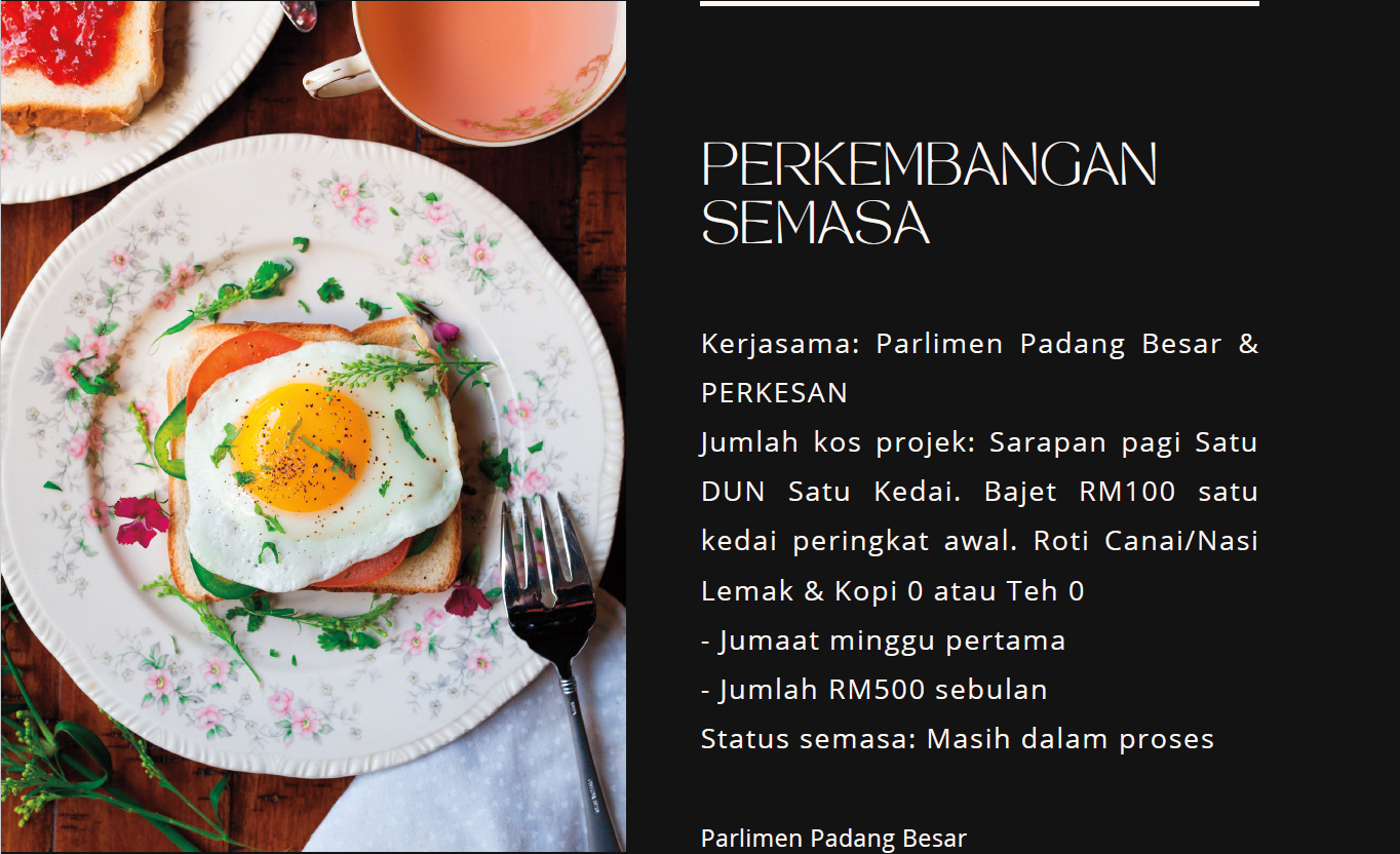 Parlimen Padang Besar mengambil inisiatif untuk membantu penduduk Padang Besar yang kurang berkemampuan dengan menyediakan sarapan pagi percuma di kedai yang terpilih di 5 Dun dalam kawasan Padang Besar.
